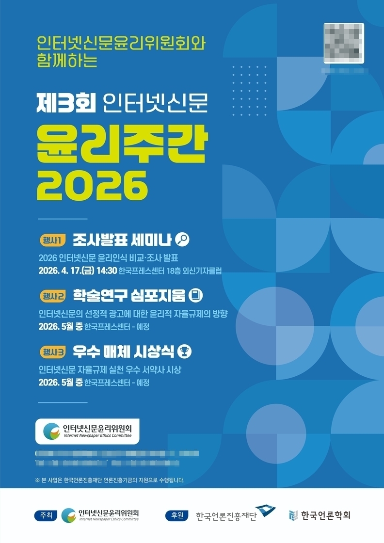 [서울타임즈뉴스 = 허성미 기자] 인터넷신문의 윤리 수준과 자율규제 방향을 점검하는 ‘제3회 인터넷신문윤리주간 2026’이 오는 17일 개막한다. 인터넷신문윤리위원회가 주최하는 이번 행사는 인터넷신문 신뢰도 제고와 건전한 미디어 환경 조성을 목표로 마련됐다. 이번 행사는 조사발표 세미나와 학술 심포지움, 우수 매체 시상식 등으로 구성된다.