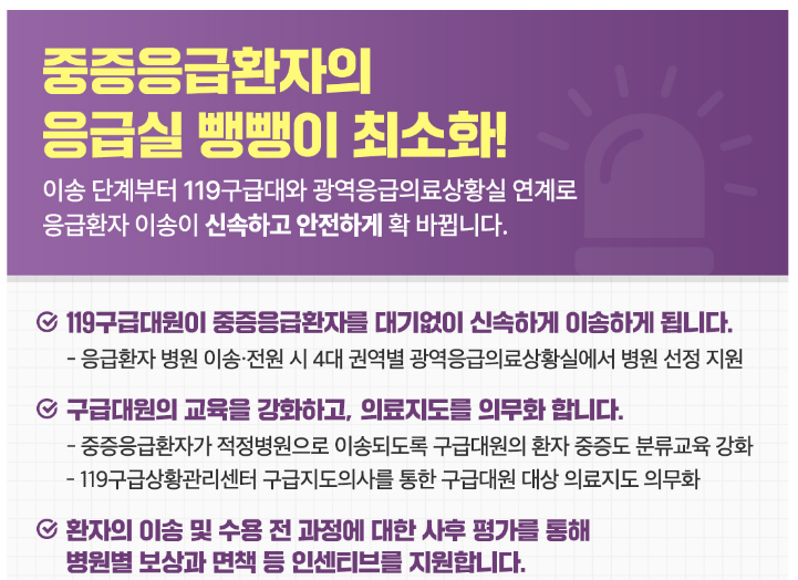 - 신속한 응급환자 이송을 위해 광역응급의료상황실이 병원 선정 지원