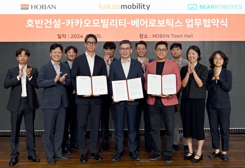 지난 5일 서초구 호반파크에서 진행된 협약식에는 문갑 호반건설 경영부문 대표, 장성욱 카카오모빌리티 미래이동연구소장, 하정우 베어로보틱스 대표 등 주요 관계자들이 참석했다.