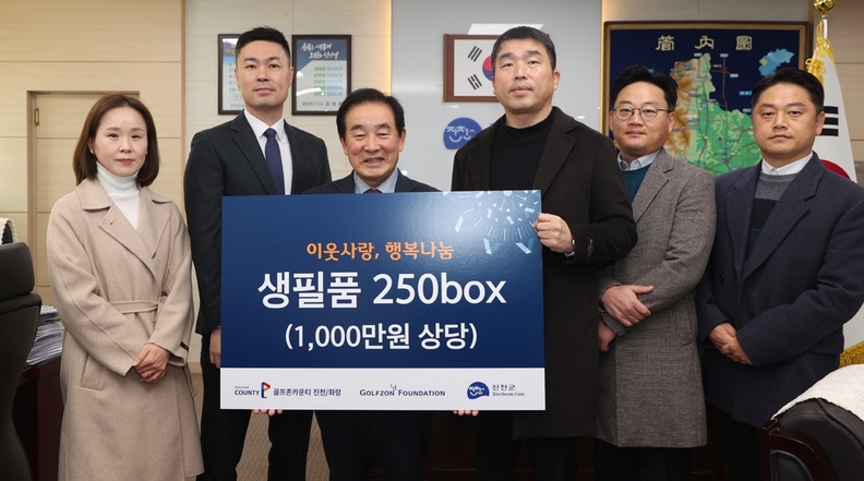 이번 진천군 후원식에는 박영준 골프존문화재단 팀장, 권준기 골프존카운티 사업부장, 송기섭 진천군수 등 관계자가 참석한 가운데 지역 취약계층 250세대를 위한 1천만 원 상당의 생필품 키트를 전달하는 시간을 가졌다.