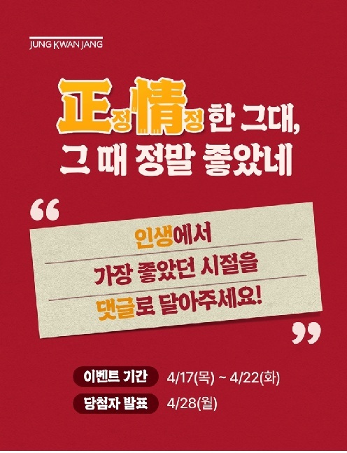 [서울타임즈뉴스 = 서연옥 기자] 정관장은 5월 가정의 달을 앞두고 오는 22일까지 ‘正(정)情(정)한 그대, 그때 정말 좋았네’ 깜짝 댓글 이벤트를 실시한다고 밝혔다.