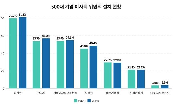 두 번째 많은 위원회는 ESG위원회로, 57%에 해당하는 212개 기업이 운영중이다. 2020년 도입돼 2021년부터 본격화된 ESG(환경·사회·지배구조) 경영이 5년차에 접어들었으나 국내 500대 기업 중 ESG위원회를 설치한 비중은 2021년 44.5%, 2022년 48.5%, 2023년 53.7%로 최근에야 절반을 갓 넘어섰다.