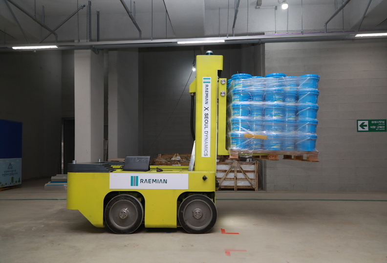 먼저 서울다이나믹스의 자율주행 지게차와 자재 이동 로봇은 현장에서 작업이 없는 야간에 자재를 자동으로 운반함으로써 주간 작업 공정 간섭을 최소화하고 작업 효율을 높인다. 자율주행 지게차는 현장에 야적된 팔레트를 인식해 자재를 지하의 아파트 각 동 별 지정된 장소로 운반한다. 이후 자재 이동 로봇은 분배된 자재를 싣고 엘리베이터를 호출하고 탑승해 아파트 호실 내부까지 운반·하역한다.