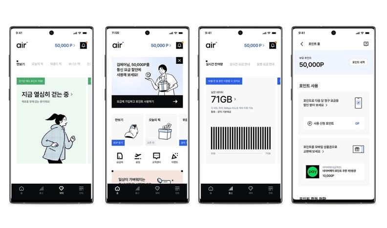 에어의 포인트샵에서는 네이버페이포인트, 편의점∙백화점∙올리브영 상품권 등 1000여 종의 인기 상품을 구매할 수 있도록 구성해 포인트 활용도를 높였다. 에어 앱은 디지털 네이티브 세대의 라이프스타일을 반영해 앱 하나로 모든 것을 쉽고, 편리하고, 직관적인 고객 경험을 구현하는데 방점을 두고 있다. 에어 서비스는 회원가입부터 개통, 해지, 고객상담, 부가서비스 가입 등 모든 서비스를 앱을 통해 고객이 셀프로 처리 가능하다. 특히 복잡하고 어려웠던 회선 가입 과정을 쉽고 빠르게 바꿨다.