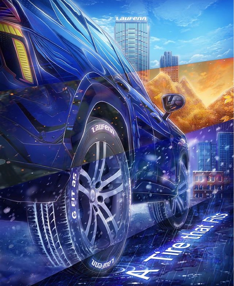 두 번째 작품은 ‘A Tire that Fits’를 주제로 어느 계절, 어느 도로에도 적합한 사계절용 데일리 컴포트 타이어 ‘지 핏 AS’를 표현했다. 한 장의 이미지에 사계절을 그려내, 어느 계절, 어느 도로에나 적합한 라우펜의 브랜드 슬로건을 선명하고 입체적인 효과로 담아냈다.
