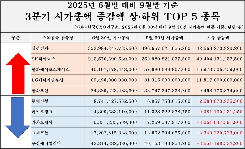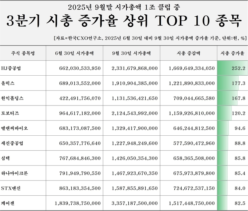 기업분석전문 한국CXO연구소는 9일 이같은 내용을 골자로 한 ‘2025년 6월말 대비 9월말 기준 3분기 국내 주식시장 시가총액 변동 현황 분석’ 결과를 발표했다. 조사 대상 주식종목(코스피+코스닥+코넥스)은 우선주를 제외한 2765곳이고, 올해 6월말(6월30일)과 9월말(9월30일) 시총 변동 금액과 순위 등을 비교해 살펴봤다. 시총은 한국거래소 자료를 참고했다.
