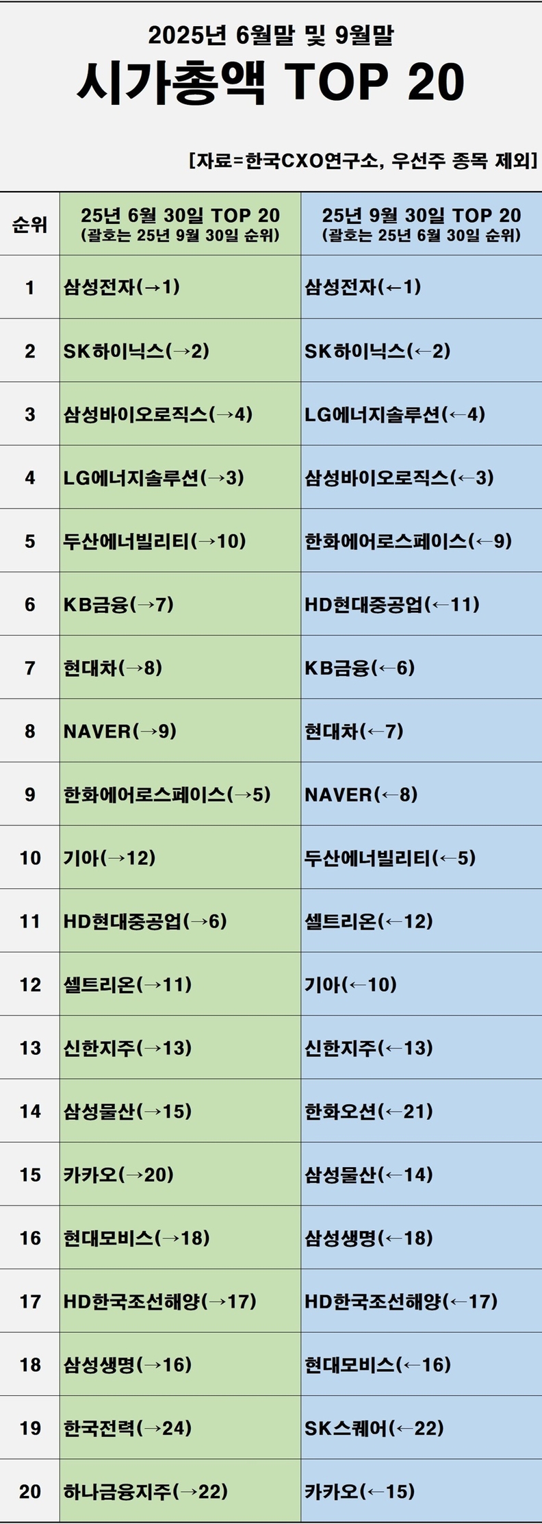 국내 주식시장을 선두에서 이끄는 시총 상위 톱 20 순위도 출렁거렸다. 특히 상위 20곳 중 2곳은 2분기 때와 달리 3분기 때 시총 톱 20에 신규 진입하거나 탈락해 명암이 엇갈렸다. 지난 6월말과 9월말에 동일한 시총 순위를 지킨 곳은 4곳밖에 되지 않았다. 여기에는 ▲삼성전자(1위) ▲SK하이닉스(2위) ▲신한지주(13위) ▲HD한국조선해양(17위)이 명단에 포함됐다.
