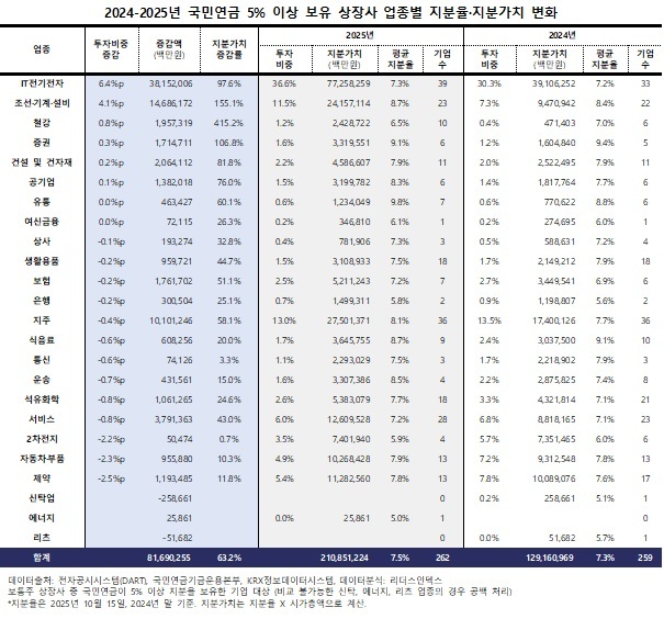 국민연금이 지분을 늘린 기업은 162곳, 줄인 곳은 76곳으로 집계돼 확대 종목이 훨씬 많았다. 국민연금이 보유한 지분가치의 47.1%는 상위 10개 대형 상장사에 집중됐다. 그 가운데 특히 삼성전자(17.9%→20.2%)와 SK하이닉스(7.4%→10.7%) 두 종목 비중만 30.9%에 달하며 쏠림 현상이 한층 뚜렷해졌다. 업종별 평균 보유지분율은 연초 증권(9.4%)·식음료(9.1%)·유통(8.8%)·조선·기계·설비(8.4%) 순이다. 하지만 현재는 유통(9.8%)·증권(9.1%)·식음료(8.7%)·조선·기계·설비(8.7%) 순으로 재편됐다.