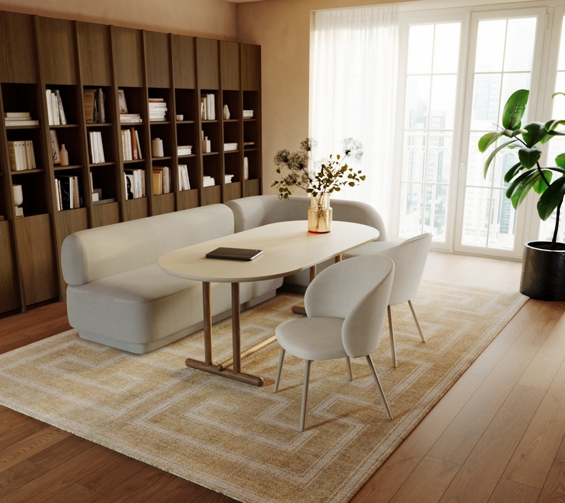 소파형 벤치 높이에 맞춰 테이블도 일반 식탁보다 약 50mm 낮은 680mm의 저상형으로 설계했으며, 상판에는 열과 오염에 강한 포세린 세라믹, 다리에는 원목 소재를 적용해 안정감을 더했다. 좌석에는 발수 · 방오 기능성 패브릭을 사용해 실용성과 관리 편의성을 높였다.