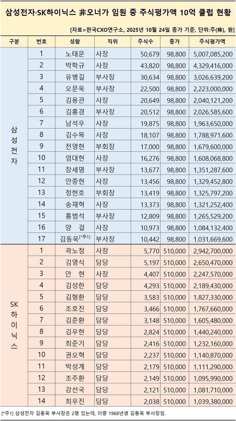 한국CXO연구소는 26일 ‘2025년 10월 24일 기준 삼성전자·SK하이닉스 비오너 임원 주식평가액 분석’ 결과를 발표했다. 조사 대상은 양사 반기보고서에 등재된 등기 및 미등기 임원이며, 금융감독원 전자공시시스템에 공시된 보유주식 현황과 해당일 종가를 기준으로 평가액을 산출했다.