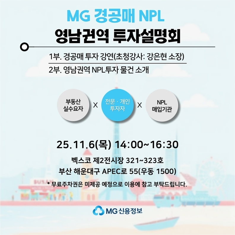 [서울타임즈뉴스 = 최남주 기자] MG신용정보(대표이사 박준철)는 오는 11월 6일 ‘2025년 경·공매 NPL 영남권역 투자설명회’를 연다고 27일 밝혔다. 4회차인 이번 투자설명회는 부산광역시 우동에 위치한 벡스코 제2전시장에서 개인 및 기관투자자 150명을 대상으로 진행된다.