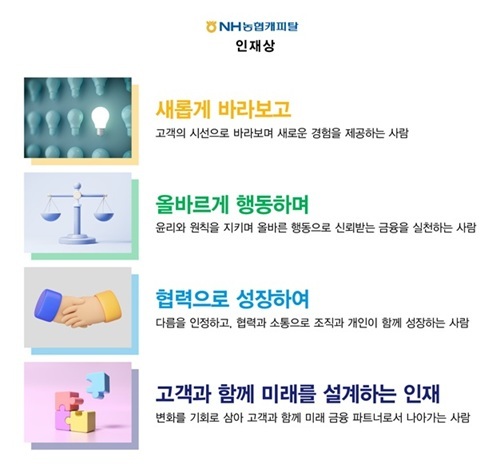 NH농협캐피탈의 새로운 인재상은 ‘새롭게 바라보고, 올바르게 행동하며, 협력으로 성장하여, 고객과 함께 미래를 설계하는 인재’로 고객 중심의 금융 실천을 기반으로 혁신과 성장을 동시에 추구하는 NH농협캐피탈의 경영 철학을 반영한 것이다.