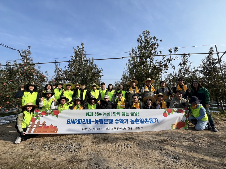 [서울타임즈뉴스 = 최남주 기자] NH농협은행(은행장 강태영) 자금시장부문은 지난 30일 BNP파리바와 함께 경기도 포천시 관인농협 관내 사과 농가에서 수확기 농촌 일손 돕기를 실시했다고 1일 밝혔다.