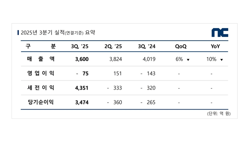 [서울타임즈뉴스 = 최남주 기자] 엔씨소프트가 올해 3분기 퇴직 위로금 등 일회성 비용 영향으로 영업 손실을 기록했다. 다만 해외 매출이 빠르게 증가하며 체질 개선에 속도가 붙고 있고, 신작 기대작 ‘아이온2’를 비롯한 대규모 라인업 공개로 실적 반등을 노린다.
