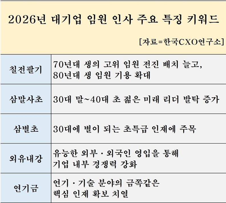 [서울타임즈뉴스 = 최남주 기자] 2026년 대기업 임원 인사의 핵심 키워드는 무엇일까? 한국CXO연구소는 19일 올 연말과 내년 초 단행되는 대기업 임원 인사 키워드의 특징을 ‘칠전팔기, 삼말사초, 삼별초, 외유내강, 연기금’ 등의 키워드로 함축 발표해 눈길을 끌었다. 각각은 ▲70·80년대생 임원 전진 배치 ▲30대 말~40대 초반의 고속 승진 ▲30대 임원의 깜짝 발탁 ▲외부·외국인 인재 영입 확대 ▲연구·기술 인재 중용 강화 등을 의미한다.
