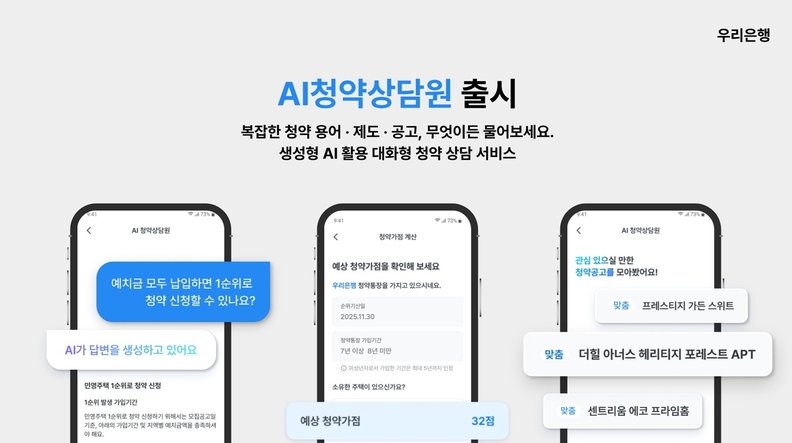 우리은행은 앞서 ‘AI예적금상담원’, ‘AI대출상담원’을 출시한 데 이어 AI청약상담원까지 선보이며 AI뱅커 서비스를 지속적으로 확대하고 있다. 우리은행 관계자는 “청약과 관련된 모든 궁금증을 해결할 수 있는 대표 채널로 자리 잡는 것이 목표”라며 “AI 기술을 활용해 더욱 정확하고 체계적인 상담 경험을 제공하겠다”고 말했다.