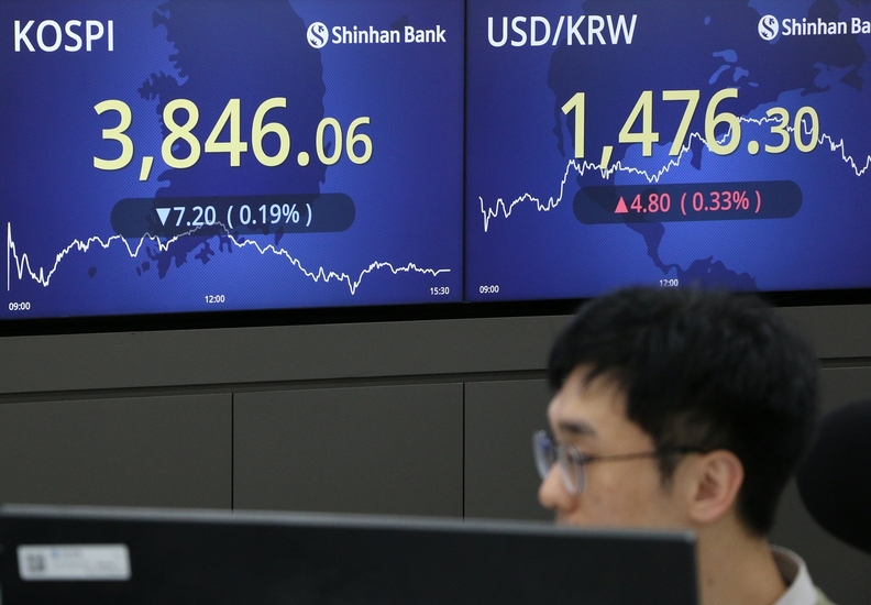 24일 연합뉴스에 따르면 코스피는 전장보다 7.20포인트(0.19%) 내린 3,846.06으로 거래를 마쳤다. 직전 거래일 3.79% 급락의 충격 속에서 이날 지수는 3,915.16으로 출발해 장 초반 3,917.16까지 뛰었으나 상승 폭을 점차 축소했고, 결국 약세로 돌아섰다. 외환시장에서도 투자심리를 위축시키는 흐름이 이어졌다. 오후 3시 30분 기준 원/달러 환율은 전장 대비 1.5원 오른 1,477.1원. 이날 1,472.0원에 하락 출발했지만 장중 상승 반전하며 외국인 매도 요인으로 작용했다.