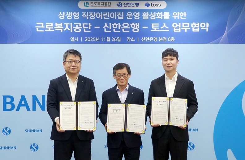 [서울타임즈뉴스 = 최남주 기자] 신한은행(은행장 정상혁)은 서울 중구 본점에서 근로복지공단(이사장 박종길), 토스(대표 이승건)와 함께 저출산 문제 대응과 중소기업 근로자의 보육 부담 완화를 위한 ‘상생형 공동직장 어린이집’ 협력 운영 업무협약을 체결했다고 26일 밝혔다.