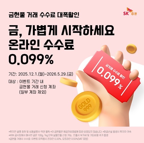 참여 조건은 별도로 없고, 금현물 거래 신청만으로 온라인 수수료 0.099%가 자동 적용된다. 실거래 조건이나 유지 조건 없이 누구나 간편하게 참여할 수 있어 접근성이 높다는 점이 강점이다. SK증권 관계자는 “고객들의 큰 호응에 힘입어 이벤트를 연장하게 됐다”며 “앞으로도 다양한 자산 투자 기회를 제공하겠다”고 밝혔다.