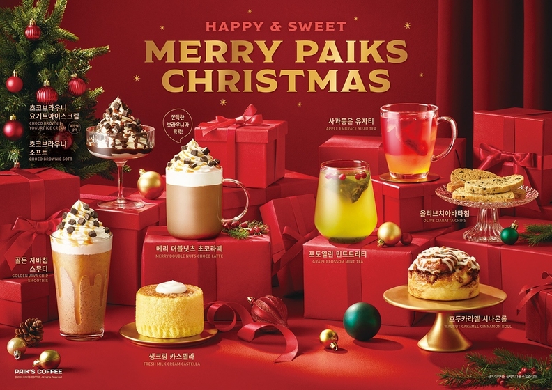 [서울타임즈뉴스 = 서연옥 기자] 더본코리아(대표 백종원)의 커피전문점 브랜드 빽다방이 연말 크리스마스 시즌을 맞아 시즌 한정 메뉴 8종을 출시한다고 28일 밝혔다. ‘HAPPY & SWEET, MERRY PAIKS CHRISTMAS’를 테마로 연말의 따뜻함과 설렘을 담은 다양한 신메뉴를 선보인다.