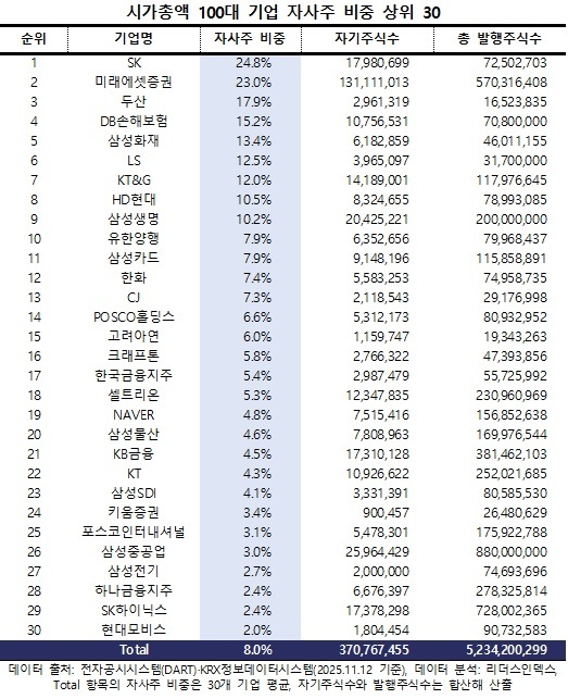 이 개정안이 시행되면 경영권 측면에서 직접적 영향을 받는 곳은 자사주 비중이 높은 대형 상장사들이다. 시가총액 상위 100대 기업 가운데 SK㈜(24.8%), 미래에셋증권(23.0%), 두산(17.9%), DB손해보험(15.2%), 삼성화재(13.4%), LS(12.5%), KT&G(12.0%), HD현대(10.5%), 삼성생명(10.2%) 등은 모두 발행주식 대비 높은 비율의 자사주를 보유하고 있다.