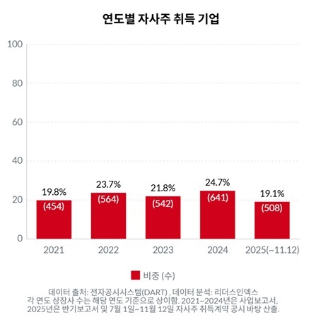 2일 리더스인덱스(대표 박주근)가 지난달 12일 기준 상장사 2658개를 대상으로 최근 5년간 자사주 취득 흐름을 살펴본 결과, 자사주를 매입한 기업 비중은 해마다 19~24% 수준을 기록했다. 특히 지난해에는 2591개 상장사 가운데 641개 기업이 자사주를 취득하며 24.7%로 가장 높은 비중을 보였다. 올해도 508개사(19.1%)가 자사주 매입을 진행한 것으로 확인됐다.
