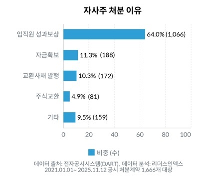 그러나 처분 결과는 이와 완전히 달랐다. 자사주가 어떻게 쓰였는지를 보여주는 처분 공시 1666건을 분석한 결과, ‘임직원 성과보상’이 1066건으로 64.0%를 차지했다. 이어 ‘자금 확보’ 목적이 188건(11.3%), ‘교환사채 발행’ 172건(10.3%), ‘주식교환’이 81건(4.9%)으로 뒤따랐다. 이는 주주가치 제고보다는 회사의 재무적 필요나 우호지분 확보를 통한 경영권 보호 성격이 강한 방식들이다.