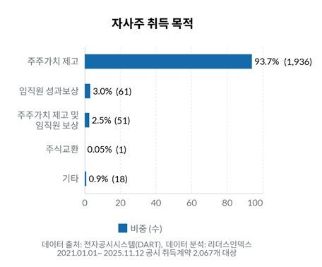 이들 기업이 자사주를 취득할 때 내세운 명분은 대부분 ‘주주가치’였다. 5년간 제출된 자사주 취득 계획 공시 2067건 가운데 1936건(93.7%)에서 ‘주주가치 제고’가 명시됐다. 이에 비해 ‘임직원 성과보상’은 61건(3.0%), ‘주주가치 제고&임직원 보상’을 병기한 경우는 51건(2.5%)이다. ‘주식교환’ 목적은 단 1건에 불과했다.
