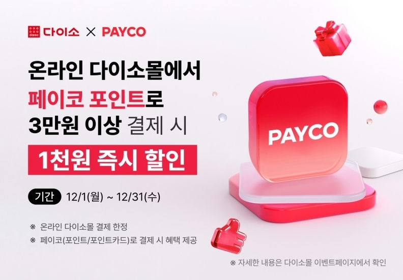 [서울타임즈뉴스 = 서연옥 기자] ㈜아성다이소 다이소몰에서 연말을 맞아 12월 1일부터 31일까지 ‘페이코 이벤트’를 진행한다고 2일 밝혔다. 다이소몰에서 페이코(포인트/포인트카드)로 3만원 이상 결제 시 1,000원을 즉시 할인해준다.