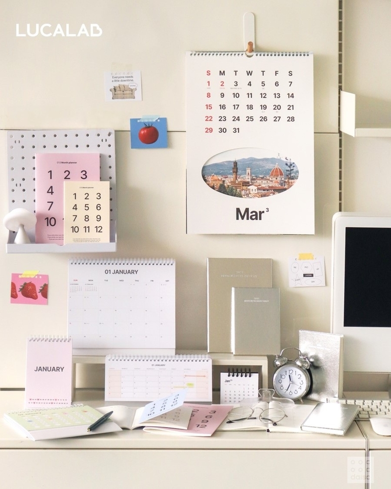탁상형 달력 형태의 ‘루카랩 습관 체크 캘린더’는 앞뒷면을 같은 월에 각기 다른 용도로 사용할 수 있다. 앞면은 일정과 계획을 기록하는 일반 달력으로 사용하고, 뒷면은 월(月) 옆에 독서, 운동 등 지키고 싶은 습관을 기록한 후 일자별로 체크하기 편리하게 디자인했다.