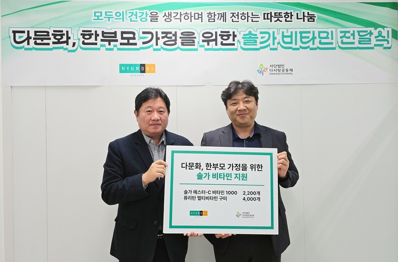 [서울타임즈뉴스 = 서연옥 기자] 현대백화점그룹 현대바이오랜드는 3일 연말을 맞아 건강기능식품 6,200개를 경기도 안양시에 위치한 사단법인 다사랑공동체에 전달했다고 밝혔다. 이날 전달식에는 박종택 바이오랜드 브랜드사업부장(상무)와 성재호 다사랑공동체 대표가 참여했다.
