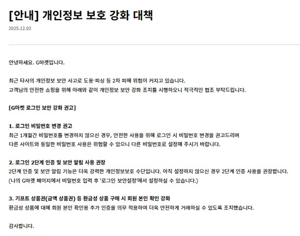 G마켓은 사고 직후 비밀번호 변경 권고, 로그인 2단계 인증 강화, 보안 알림 기능 활성화 안내, 환금성 상품 구매 시 본인 인증 절차 강화 등 긴급 보안 조치를 시행했다. 특히 기프트 상품권 구매 시 추가 인증을 의무화해 유사 피해 차단에 나섰다. G마켓은 “신속한 조치 이후 추가 피해 신고는 들어오지 않고 있다”고 밝혔다.