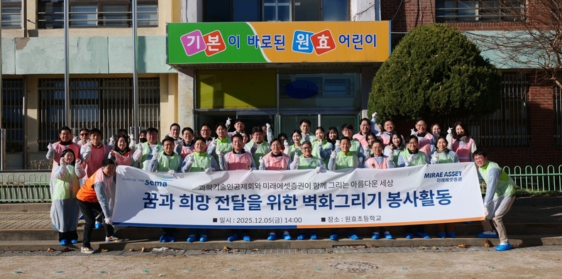 [서울타임즈뉴스 = 최남주 기자] 미래에셋증권과 과학기술인공제회는 지난 5일 서울 용산구 원효초등학교에서 합동 벽화 그리기 봉사활동을 진행했다고 8일 밝혔다. 이번 봉사활동은 노후된 학교 시설을 정비하고 학생들에게 밝고 안전한 교육환경을 마련하기 위해 추진됐다.
