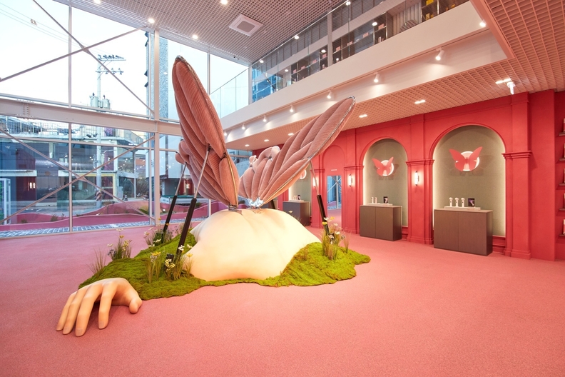 메디큐브 성수는 총 450㎡(약 136평) 규모로, 브랜드가 지향하는 정체성을 공간 전반에 담아낸 것이 특징이다. 내부는 ‘핑크 페어리(요정)’ 콘셉트를 바탕으로 핑크·화이트 톤과 메탈 소재를 조화시켜 신비롭고 세련된 분위기를 연출했다. 입구에는 분홍색 날개를 단 페어리 오브제를 설치해 ‘피부가 다시 날개를 얻는 순간’이라는 메시지를 상징적으로 표현했고, 이를 중심으로 매장 동선을 자연스럽게 확장하는 디자인을 적용해 작은 체험이 큰 만족으로 이어지는 ‘나비효과’를 공간에 반영했다.
