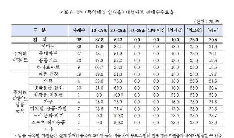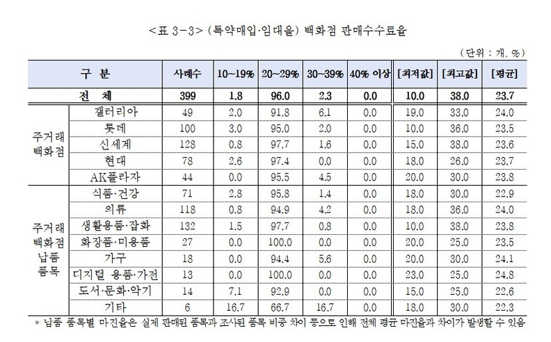 조사에 따르면 백화점 입점 기업은 특약매입(67.2%) 비중이 가장 높았다. 대형마트는 직매입 거래가 76.3%를 차지해 유통 구조의 차이가 뚜렷하게 나타났다. 중소기업이 부담하는 평균 판매수수료율은 백화점 23.7%, 대형마트 20.5%로 조사됐다. 백화점중 최고 수수료율은 신세계 38.0%, 롯데 36.0%, 갤러리아 33.0%였다. 대형마트는 이마트·하나로마트·홈플러스·롯데마트 모두 25.0%로 동일했다.