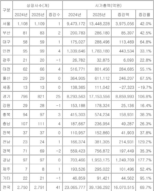 신규 상장 역시 수도권 중심으로 이뤄졌다. 올해 전체 상장사 수가 41개 증가하는 동안, 경기도에서만 25개 기업이 새롭게 상장됐다. 충남·인천·대전은 각각 4개, 충북 3개, 부산 2개 순으로 늘었다. 강원과 광주는 오히려 상장사 수가 감소했다. 신규 상장의 상당수가 수도권과 인접 지역에 집중된 셈이다.