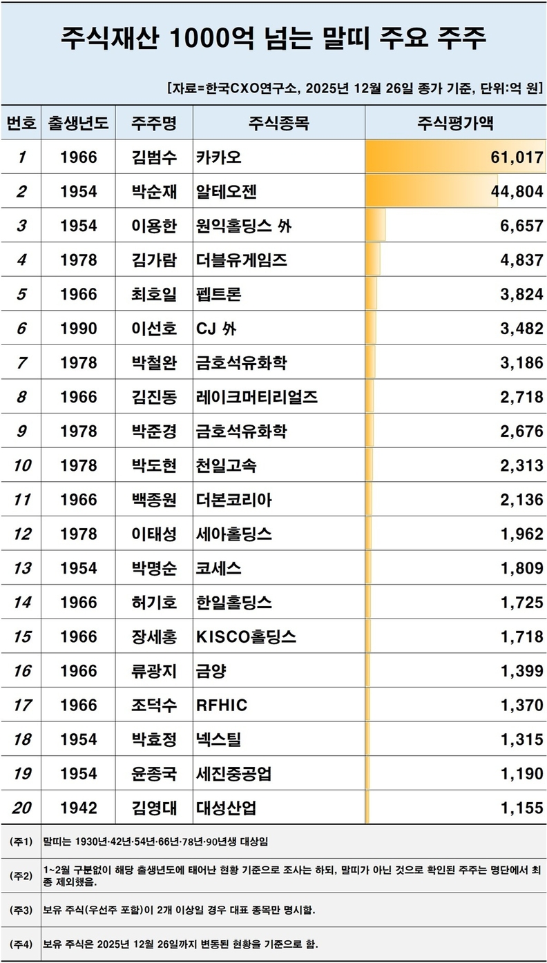 말띠 주식부자 가운데 ‘1조 클럽’에는 김범수 카카오 창업자와 박순재 알테오젠 회장이 이름을 올렸다. 김범수 창업자의 주식평가액은 6조 원대, 박순재 회장은 4조 원대를 기록했다. 아울러 1954년생인 이용한 원익그룹 회장도 대기업집단 총수로서 말띠 해를 맞는다.