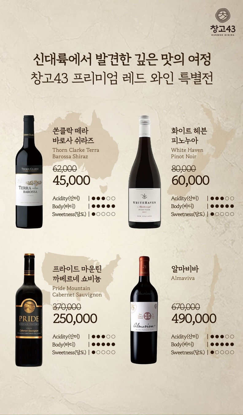 [서울타임즈뉴스 = 서연옥 기자] 다이닝브랜즈그룹의 프리미엄 한우다이닝 브랜드 창고43이 2026년 병오년(丙午年) 새해를 맞아 신대륙 와인의 다채로운 풍미를 제안하는 ‘신대륙에서 발견한 깊은 맛의 여정’ 와인 프로모션을 진행한다. 미국, 호주, 칠레, 뉴질랜드 등 이른바 ‘신대륙’이라 불리는 나라들의 대표 와인을 소개하기 위해 마련되었다.
