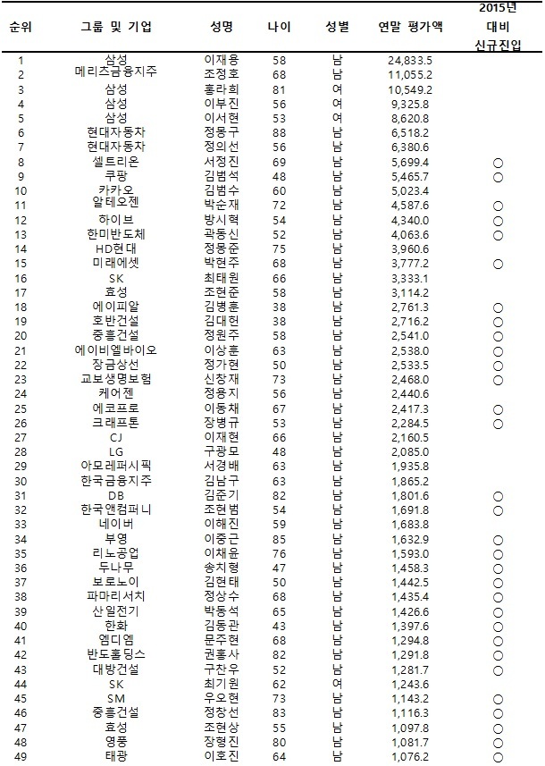 주식부호 1위는 10년 내내 삼성일가 몫이었다. 2015년에는 고(故) 이건희 선대회장이 1위를 차지했다. 현재는 아들인 이재용 삼성전자 회장이 24조8335억원으로 선두를 지키고 있다. 상위 5위 가운데 조정호 회장을 제외하면 모두 삼성가 인물들이다.