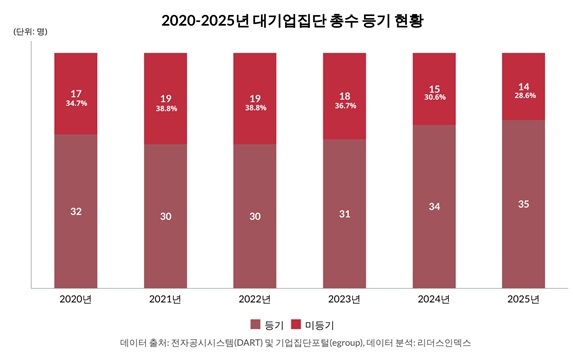 13일 기업분석연구소 리더스인덱스가 자산규모 5조원 이상 대기업집단 가운데 오너가 동일인이며 2020년부터 2025년까지 비교 가능한 49개 그룹을 조사한 결과, 동일인이 맡은 등기임원 직위는 2020년 117개에서 2025년 100개로 14.5% 감소했다. 같은 기간 오너 친인척의 등기임원 등재 건수도 360건에서 358건으로 소폭 줄었다. 수치상 변화 폭은 크지 않지만, 장기간 이어지던 ‘다수 계열사 등기임원 겸직’ 관행이 완만하게나마 꺾였다는 점에서 의미가 있다는 분석이다.