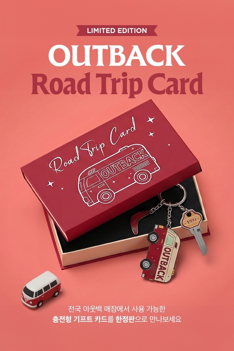 [서울타임즈뉴스 = 서연옥 기자] 다이닝브랜즈그룹의 캐주얼 다이닝 레스토랑 아웃백 스테이크하우스(이하 아웃백)가 호주 로드 트립의 낭만과 브랜드 감성을 담은 한정판 기프트카드 ‘아웃백 로드 트립 카드’를 선보인다. RFID 기능이 적용된 충전형 기프트 카드로, 아웃백만의 브랜드 아이덴티티를 감각적으로 담아냈다.