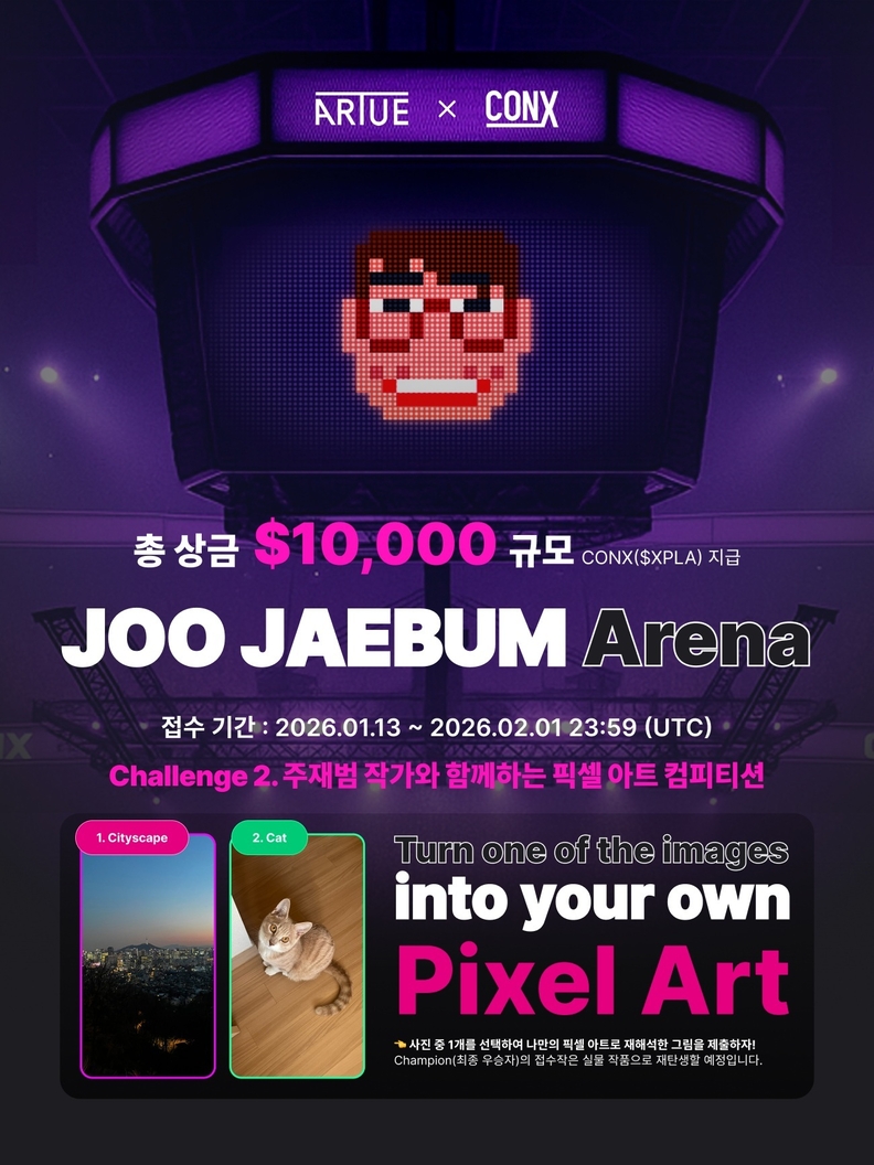 [서울타임즈뉴스 = 최명진 기자] 글로벌 블록체인 메인넷 CONX(콘엑스, 구 XPLA)가 픽셀 아티스트 ‘주재범’과 함께 웹3 아트 프로젝트 ‘주재범 아레나(JOO JAEBUM Arena)’를 진행한다고 14일 밝혔다.