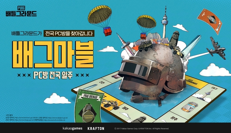 [서울타임즈뉴스 = 최명진 기자] 카카오게임즈(대표 한상우)는 ㈜크래프톤(대표 김창한) 산하 펍지 스튜디오가 개발하고 자사가 서비스중인 ‘PUBG: 배틀그라운드(이하 배틀그라운드)’의 오프라인 PC방 행사 ‘배그마블 PC방 전국 일주’를 개최한다고 15일 밝혔다.