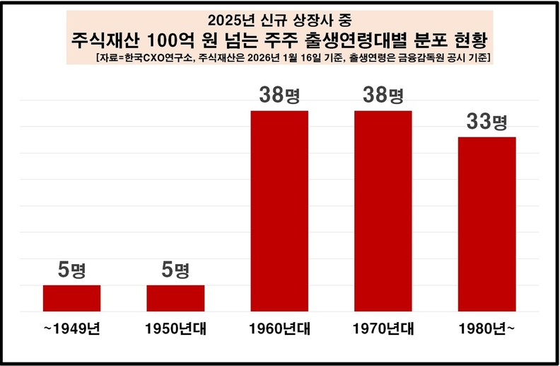 기업분석전문 한국CXO연구소가 ‘2025년 신규 상장사 대상 주식평가액 100억 넘는 주식부자 현황 조사’ 결과에서 이같은 내용의 결과가 나왔다고 19일 밝혔다. 조사 대상은 지난해 한국거래소에 신규 상장한 121개 상장사의 개인주주이다. 주식평가액은 이달 16일 종가(終價) 기준으로 계산해 100억 원 넘는 주식부자 현황을 파악했다.