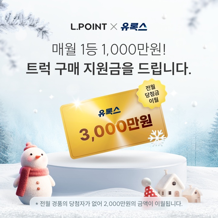 연말까지 매월 1등을 한 명씩 추첨해 1천만 원의 트럭 구매 지원금을 증정한다. 1등 당첨 대상은 전체 참여자 중 화물차, 건설기계, 중장비, 버스 등 상용차(일반 승용차, SUV 제외) 운전자다. 그러나 최근 두 달간 적격자가 1등으로 당첨되지 않아 당첨금이 이월됐으며, 이에 따라 이번 1월 31일까지 이벤트 응모 시 총 3천만 원의 1등 상금을 받을 수 있게 됐다. 2등은 차종에 상관없이 매월 20명씩 선정해 엘포인트 5만 포인트를 증정한다.