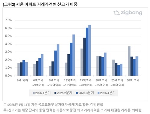 [서울타임즈뉴스 = 서연옥 기자] 지난해 서울 아파트 시장에서 신고가 계약의 중심이 초고가에서 중고가 구간으로 이동한 것으로 나타났다. 19일 부동산 플랫폼 직방이 국토교통부 실거래가 공개시스템을 분석한 결과, 서울의 30억원 초과 아파트 신고가 비중은 2025년 1분기 3.7%에서 4분기 2.4%로 낮아졌다. 반면 9억원 초과~12억원 이하 구간은 같은 기간 1.2%에서 4.0%로, 12억원 초과~15억원 이하 구간은 1.7%에서 5.2%로 크게 확대됐다.