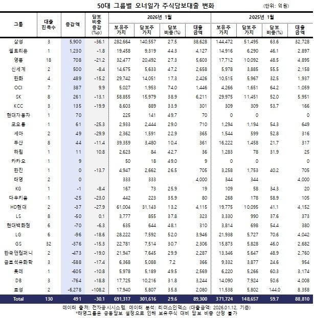 [서울타임즈뉴스 = 최남주 기자] 국내 50대 그룹 오너일가의 주식담보대출 비중이 1년새 절반 수준으로 크게 낮아진 것으로 나타났다. 보유주식 가치가 급등하면서 담보 여력이 확대된 데다, 상속세·승계자금 마련 등을 위해 활용했던 대출의 일부를 상환한 영향이 복합적으로 작용한 결과다.