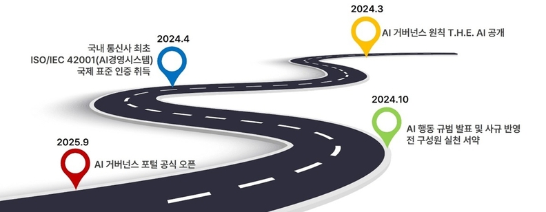 SK텔레콤은 2021년 사람 중심의 ‘AI 추구 가치’를 정립하며 윤리 경영을 선제적으로 추진해 왔다. 2024년 3월에는 자사의 AI 거버넌스 원칙인 <T.H.E. AI>를 공개하고, 같은 해 4월 국내 통신사 최초로 AI경영시스템 국제 표준인 ISO/IEC 42001 인증을 취득했다. <T.H.E. AI>는 ‘by Telco’, ‘for Humanity’, ‘with Ethics’의 약자로 연결과 신뢰, 인류 복지, 윤리적 책임을 핵심 가치로 담고 있다.
