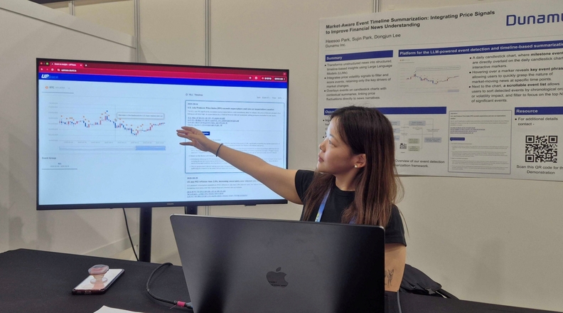 박희수 두나무 머신러닝팀 연구원은 AAAI 데모트랙에서 ‘시장 반응형 이벤트 타임라인 요약: 가격 신호 통합을 통한 금융 뉴스 이해도 향상(원문: Market-Aware Event Timeline Summarization: Integrating Price Signals to Improve Financial News Understanding)’ 논문을 발표하고, 두나무가 자체 개발한 시스템을 직접 시연했다.
