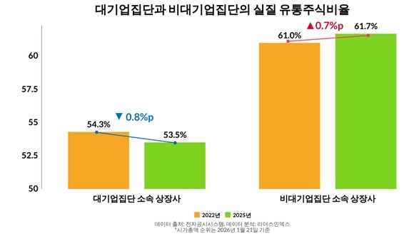 문제는 대기업집단 소속 상장사에서 더욱 두드러진다. 대기업집단 148곳의 평균 유통주식 비율은 3년 새 0.8%포인트 하락한 53.5%를 기록했다. 전체 평균 감소폭의 4배에 달한다. 반면 비(非)대기업집단 상장사는 같은 기간 61.0%에서 61.7%로 0.7%포인트 상승해 대조를 이뤘다.
